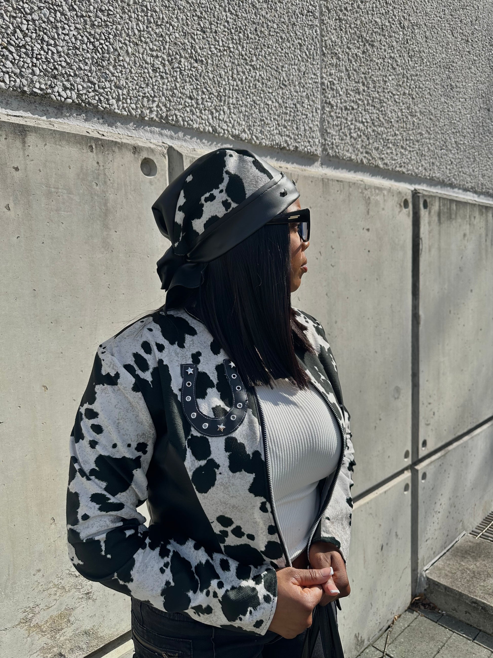 Turn heads and break necks in our statement-making Moto jacket. This piece blends bold Western vibes with urban edge, featuring a premium cow print design contrasted with sleek black faux leather panels.